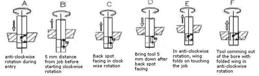Make the axis of guiding pilot shank of the automatic rear counter boring tool true to the axis of the pilot hole. Use cotter / drive-key for preventing the tool from falling down while cutting. The back spot facing tool enters the pre-drilled pilot bore in an anti-clock wise rotation of the spindle. The wing is so designed that even if it is open, it folds into the pocket on touching the job in anti-clockwise rotation. After the wing come clear of the pilot bore in anti-clock wise rotation, reverse the spindle rotation to clockwise; due to centrifugal force, the wing automatically opens up; with feed it cuts. After the spot facing is over, take the back spot facing tool little away from the job; then reverse the spindle rotation to anti-clockwise and pull the automatic back spot facing tool out of the bore. The wing automatically folds into the pocket on coming in contact with the job in anti-clockwise rotation.