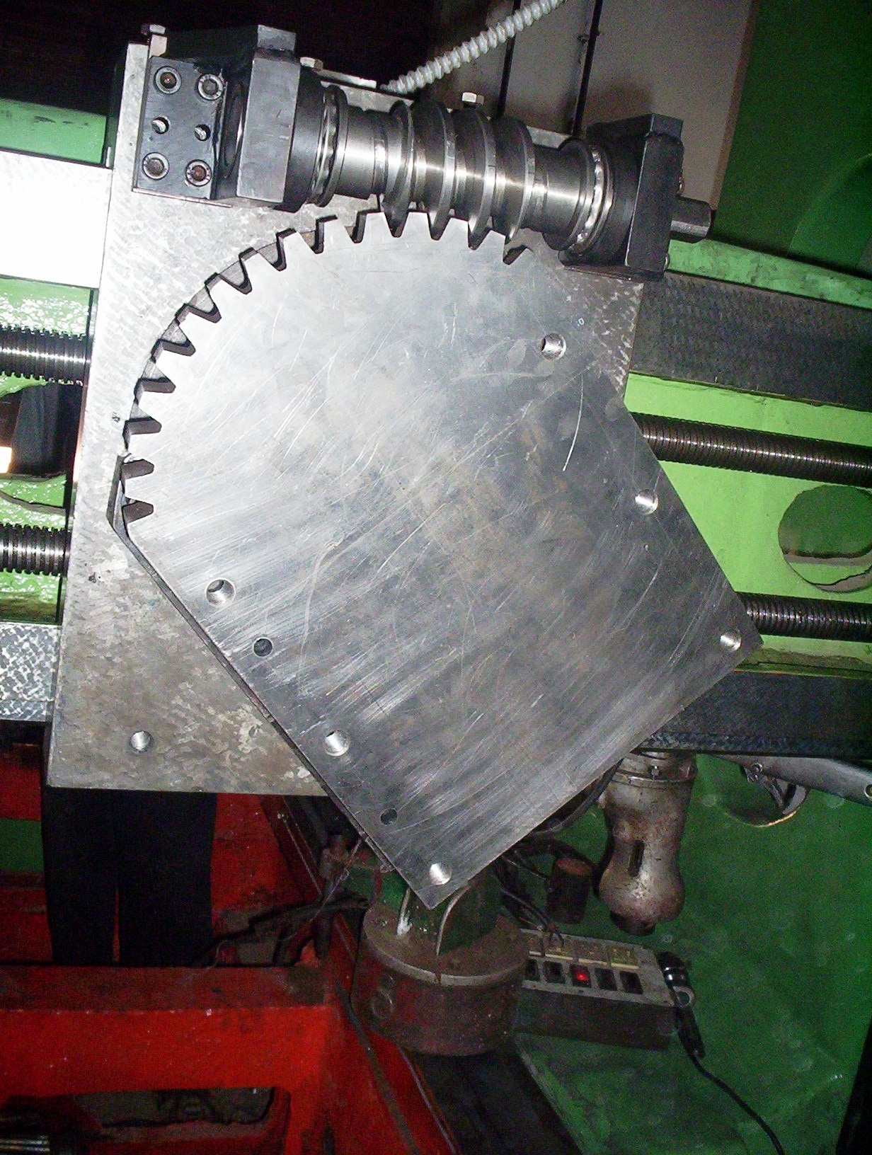 Right angle attachment, in combination with cross feed and vertical feed, adds floor boring capabilities to your converted planomiller! Jobs, which otherwise, should have been done in a floor borer, can be done in a converted plano miller.